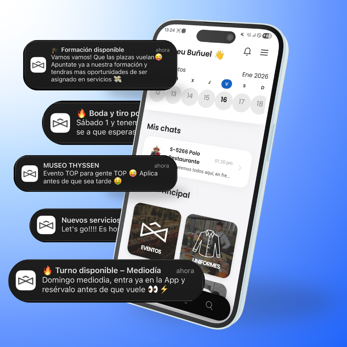 Sí. Todos los eventos disponibles se gestionan directamente desde la app de Waitser. Ahí podrás ver los turnos, aplicar a los que te interesen y recibir notificaciones si eres seleccionado. Es importante que tengas las notificaciones activadas para no perderte ninguna oportunidad.